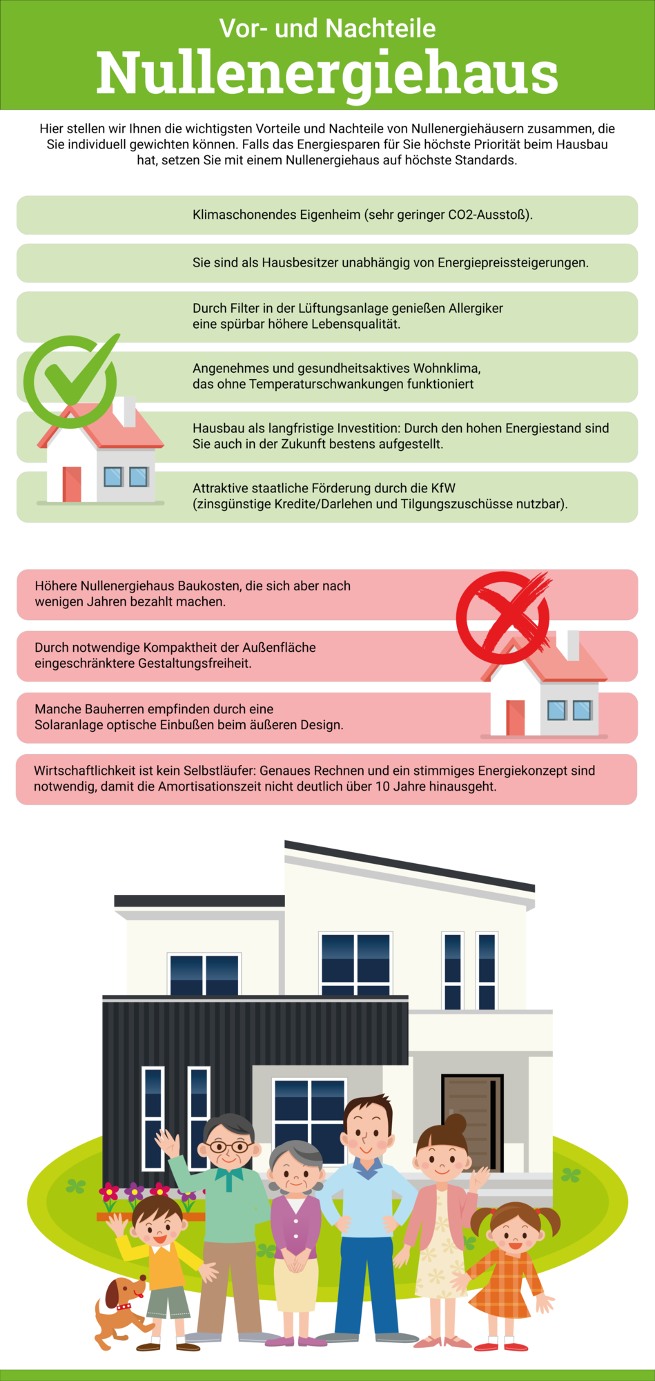 Wenn Sie ein Nullenergiehaus bauen wollen, sollten Sie bei den Kosten bzw. Mehrkosten immer langfristig rechnen. Die Erfahrungen zeigen, dass sich die Mehrkosten von Nullenergiehäusern in den meisten Fällen bereits nach 10 Jahren amortisiert haben. Spätestens ab diesem Zeitpunkt schlagen die finanziellen Vorteile dieses modernen Haustyps zu Buche, da Sie für Strom bzw. das Heizen im Idealfall keine Kosten aufzubringen haben. Sie setzen somit die zukunftsorientierte Grundlage, sich von zweifelsfrei steigenden Energiepreisen unabhängiger zu machen.