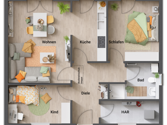 Auf rund 78 Quadratmetern finden Sie dank cleverer Planung ausreichend Platz für die ganze Familie. In den hellen, großzügig geschnittenen Zimmern wohnen Sie auf einer Ebene mit der Natur. Ob Wohnzimmer, Küche oder Schlafzimmer – überall sind Sie nur einen Schritt von Ihrem Garten entfernt.