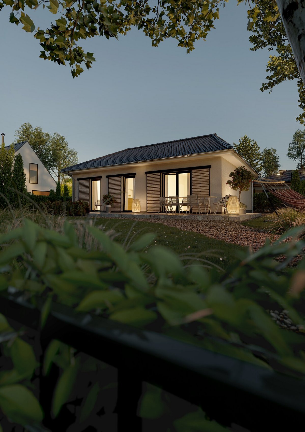 Unsere Traumhäuser kommen inklusive einer Vollausstattung. Eine Fußbodenheizung finden Sie dort ebenso wie eine umweltfreundliche Wärmepumpe vor. Zudem werden Fenster mit effektiven Sonnen- und Wärmeschutzinstallationen bestückt, das Badezimmer ist vollausgestattet und bringt eine bodentiefe Duschwanne mit. Auf dem Dach ist eine PV-Vorrichtung integriert, damit Sie später, sofern gewünscht, flexibel eine Photovoltaik-Anlage integrieren können - auch entsprechende Vorrichtungen zum Laden von E-Fahrzeugen befinden sich am Haus. Sie erhalten Ihr Massivhaus schlüsselfertig, lediglich die Tapezier- und Bodenverlegearbeiten fallen noch an - damit Sie die Inneneinrichtung der Immobilie ganz auf Ihren persönlichen Geschmack hin abstimmen können.